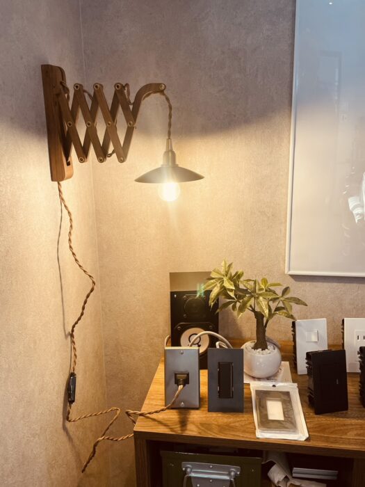 壁にはSOLIDの照明も。こちらの照明は蛇腹で長さがかわり、便利です!