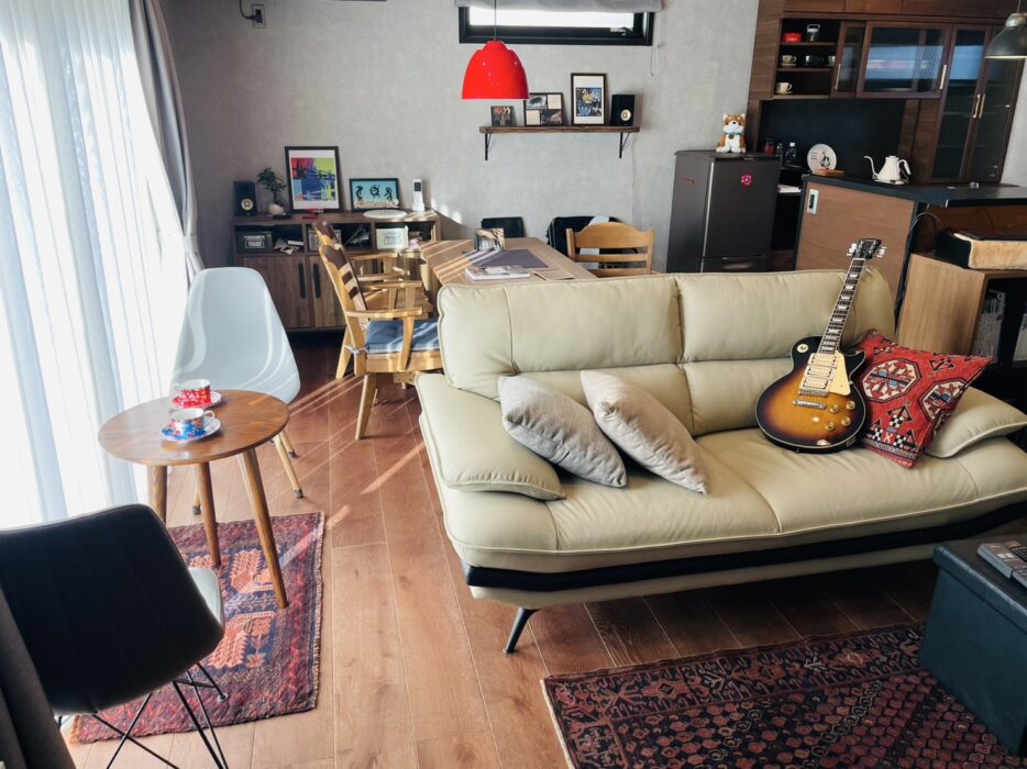 H様と私の出会いは実は食器棚を納めた時でした。その時にご自宅の隣にある事務所へお伺いし、初めてお会いしました。H様は趣味で楽器を演奏される方で、私も昔からエレキギターを弾いていたので、色々なお話をさせていただき楽しい時間を過ごさせていただきました。