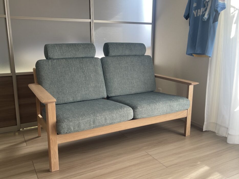 今回お選びいただいた張地は一年中さらっと使えて、色も落ち着いたブルー。横に飾ってあるユニフォームともマッチし、ジュビロファンのM様らしい、世界にひとつだけの素敵なインテリアになりました!
