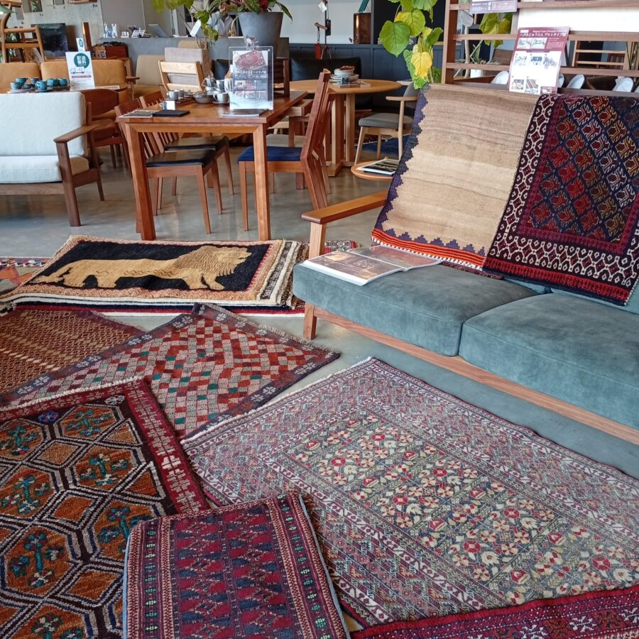 全て一点モノの絨毯が所狭しと並び、一点ずつ見て、触って、確かめながら、ご覧いただけます。