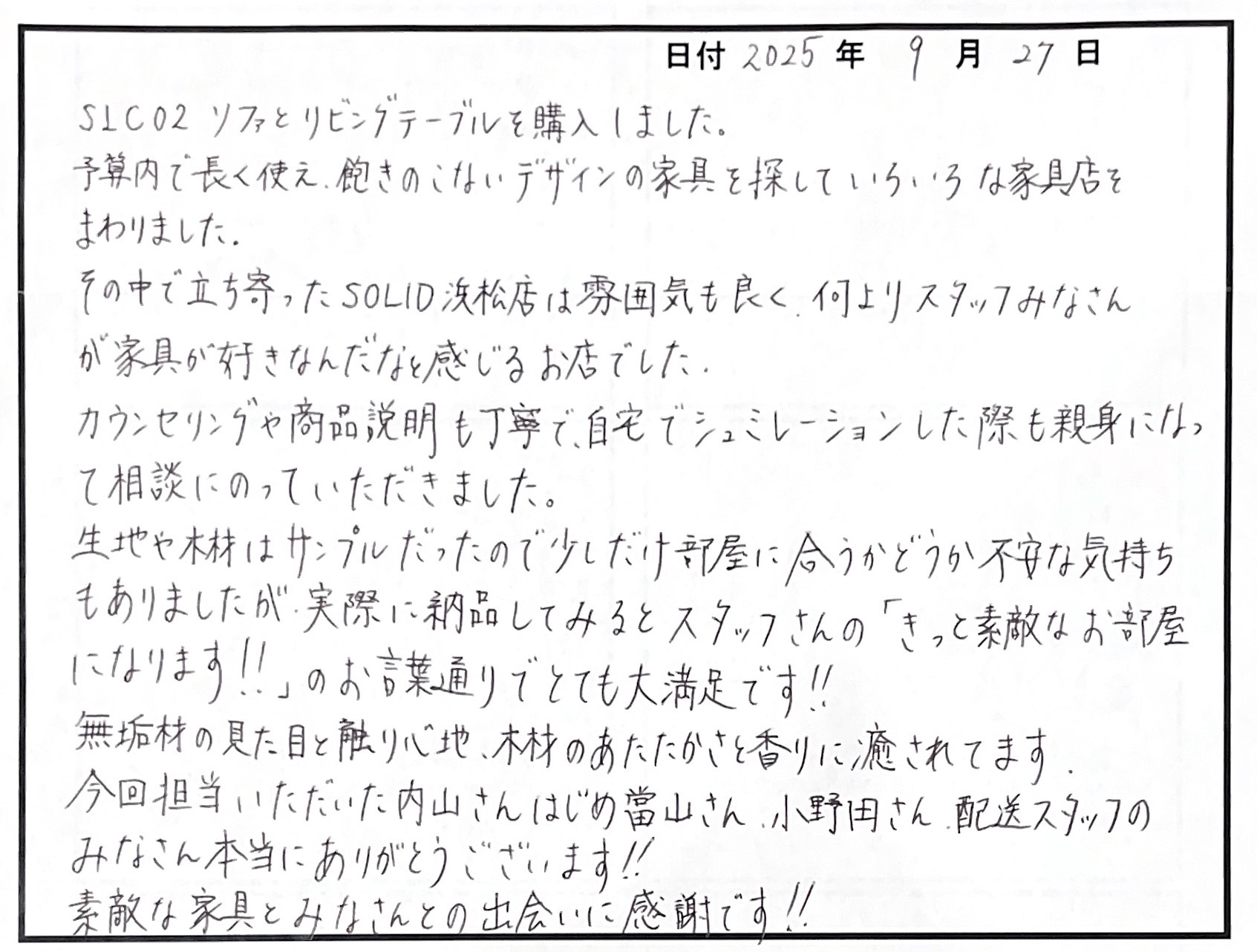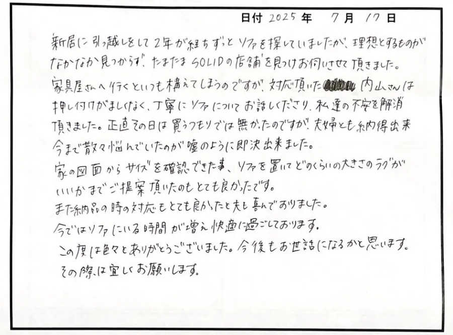 ソファだけでなく、ラグや照明、チェアとSOLIDの商品をたくさん気に入っていただきスタッフ一同大変うれしく思っております。