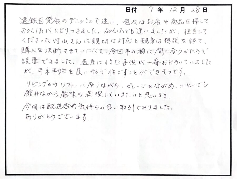 Y様、この度はSOLIDにてソファをお買い上げくださり誠にありがとうございました。 一緒にあれこれと悩む時間も楽しく、素敵なご縁を頂きとても嬉しいです。 これから季節が変わり、趣味や時間の過ごし方も少しずつ変化していく中でソファが寛ぎの場所になっていただけましたら幸いです。