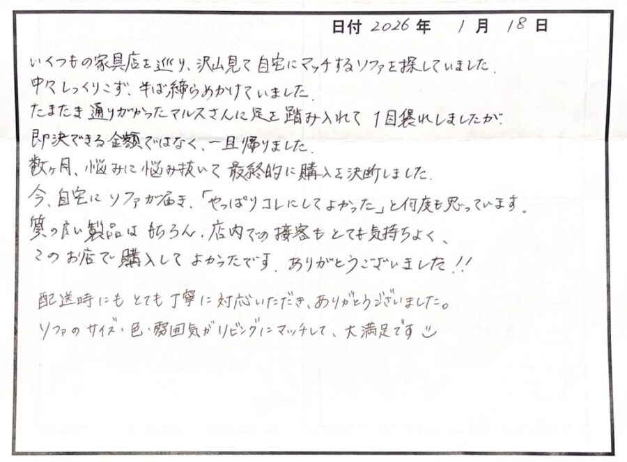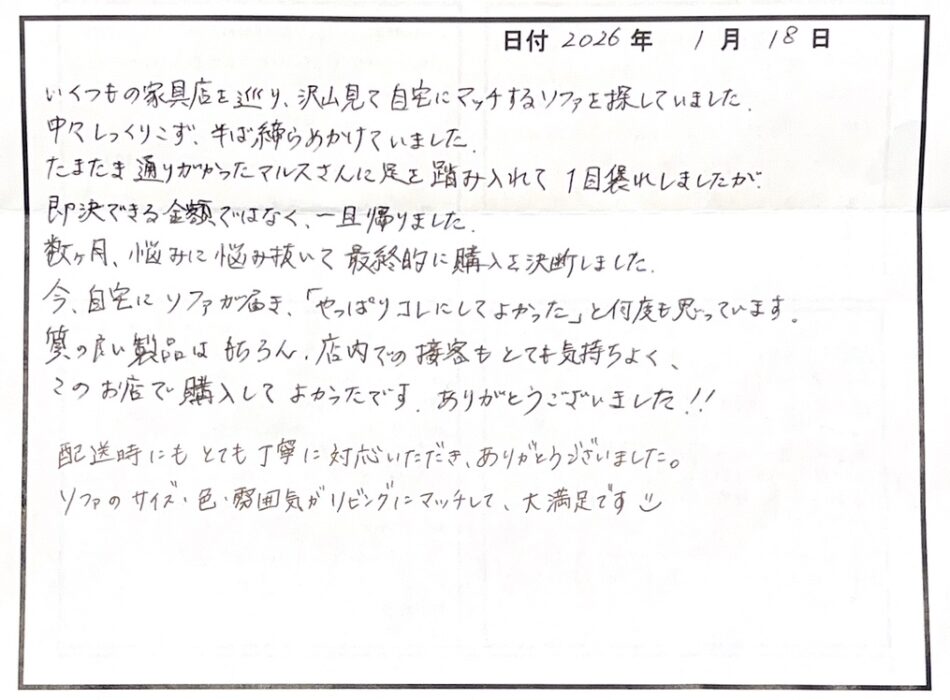 何か月も悩まれてお決めいただいたとのこと、私どものソファを気に入っていただき、私も大変嬉しく思います。